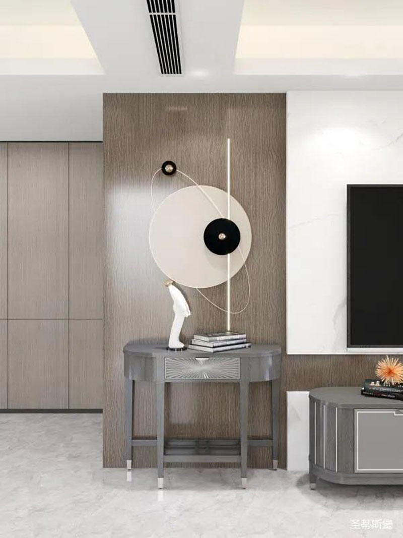 ▲設(shè)計(jì)師巧妙的運(yùn)用填充藝術(shù),將客廳電視與沙發(fā)背景色彩相呼應(yīng),利用凹凸互補(bǔ)的設(shè)計(jì)手法,傳遞著空間時(shí)尚。莫蘭迪實(shí)木家具,配以同色系的高級(jí)金屬底座,將精致輕奢從細(xì)節(jié)中脫穎而出。