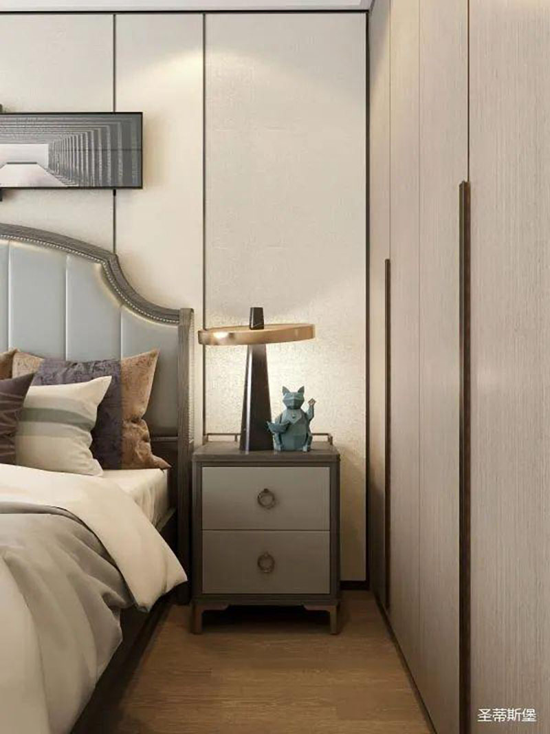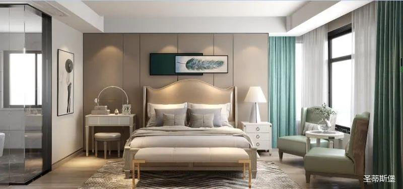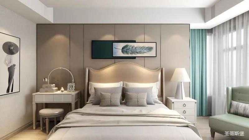▲次臥空間主要是以淺色為底調(diào),大面積的莫蘭迪色與淺色相平衡。極強(qiáng)線性裝飾畫帶來(lái)的延伸感讓視覺煥然一新。少許的金屬元素?cái)z入,瞬間提升了空間的精致度,將溫潤(rùn)雅致與時(shí)尚輕奢糅合在同一空間里,每一處都洋溢著浪漫的氣息。