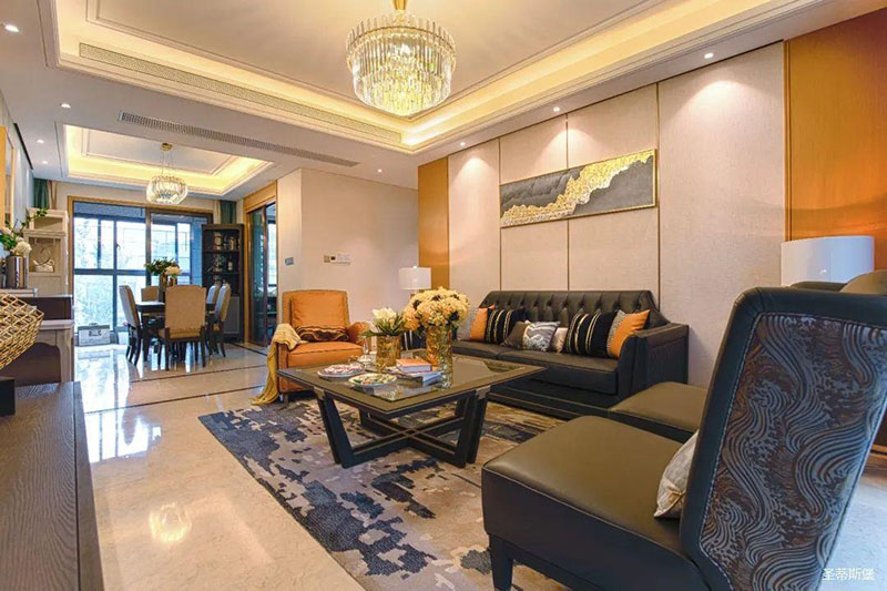 極具時尚設計格調的透明茶幾,不僅中和了沙發的厚重感,還令空間更為清透明亮!