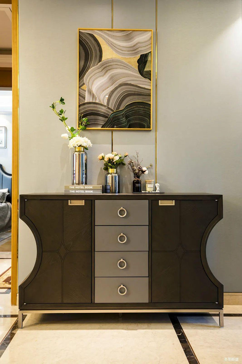 米白色餐邊柜坐落餐廳一角,簡約沿框線條,層次分明。金屬半圓與實木鑲嵌,盡顯優雅輕奢的姿態。