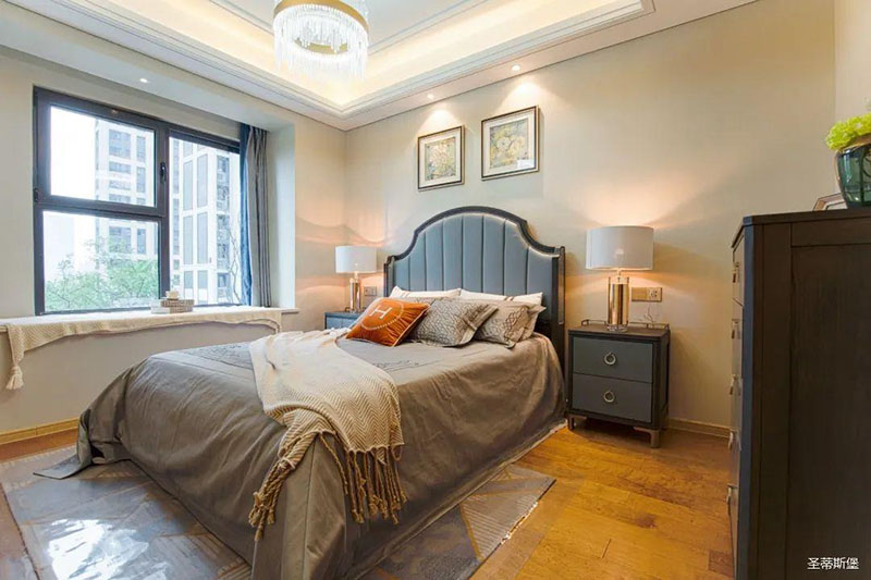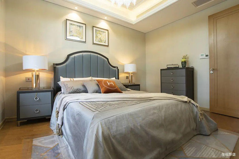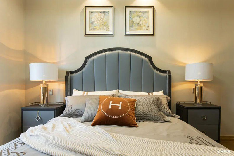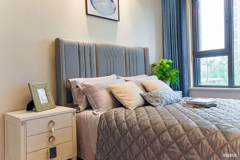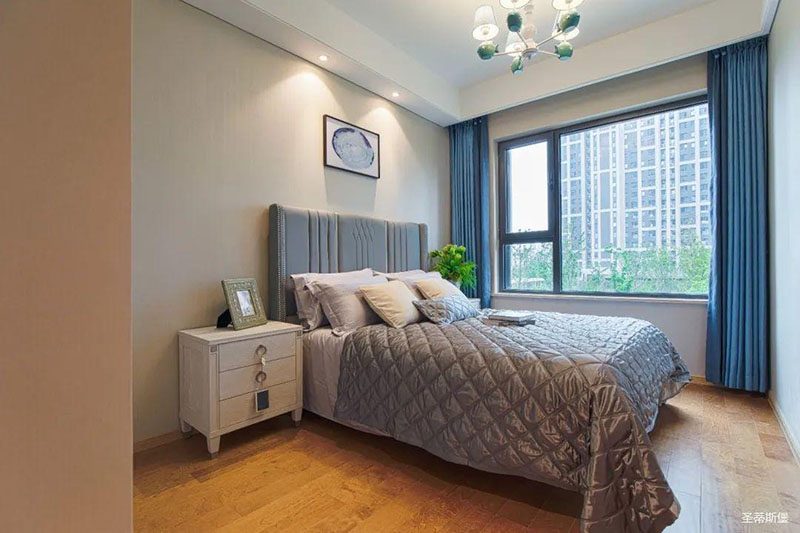 次臥高床屏由金屬鑲嵌,呈現簡約有序的線條,霧霾藍床屏與淺藍朦朧裝飾畫,窗簾相呼應,色澤搭配和諧自然,無不透漏著一種簡潔大方視覺體驗。
