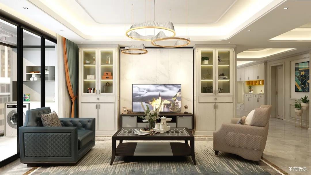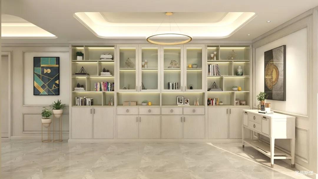 ▲?電視背景墻設計師完全根據業主家量尺所得,安裝的對稱裝飾柜,集裝飾美與實用性于一體,業主超喜歡收藏,設計師也完全滿足了業主對空間儲物的需求。