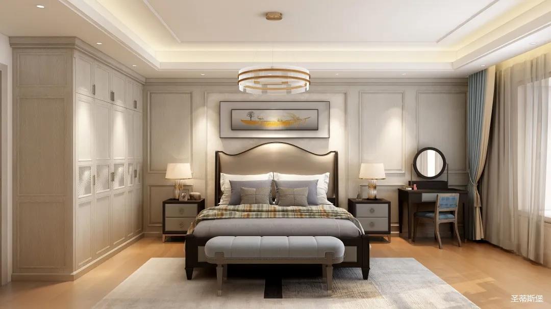▲臥室是居家的主要休息場所,在設計上需更注重舒適度。所以房間就以和諧淡雅的色彩為主,采用素雅柔和的線條布局,時尚輕奢的家具,使得空間更加的愜意和浪漫。床頭層林盡染裝飾畫,讓原本略偏美式淡雅的臥室在色彩上更添一筆。