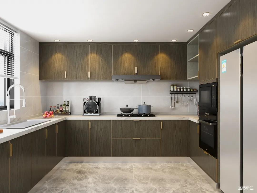 u型空間格局,設計師將功能區合理劃分,讓洗切煮一氣呵成。以米白水磨石+英倫爵士灰實木為主導的櫥柜系統中,人體工學流線,讓每一細節都折射出屋主對生活的考究,一廚一柜,每一處都關乎著我們對生活的熱忱。