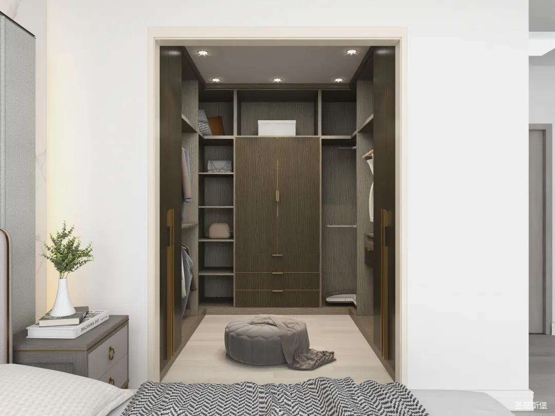 衣帽間進行u型設計,全落地定制形式,融匯了簡奢風格獨具的浪漫與優雅。金屬、實木拼接細節與天然材質為衣帽間注入與眾不同的高級氣質!開放式的懶人布局,讓衣物收納一目了然,能同時滿足疊放與掛衣功能,實現了“一柜多用”。