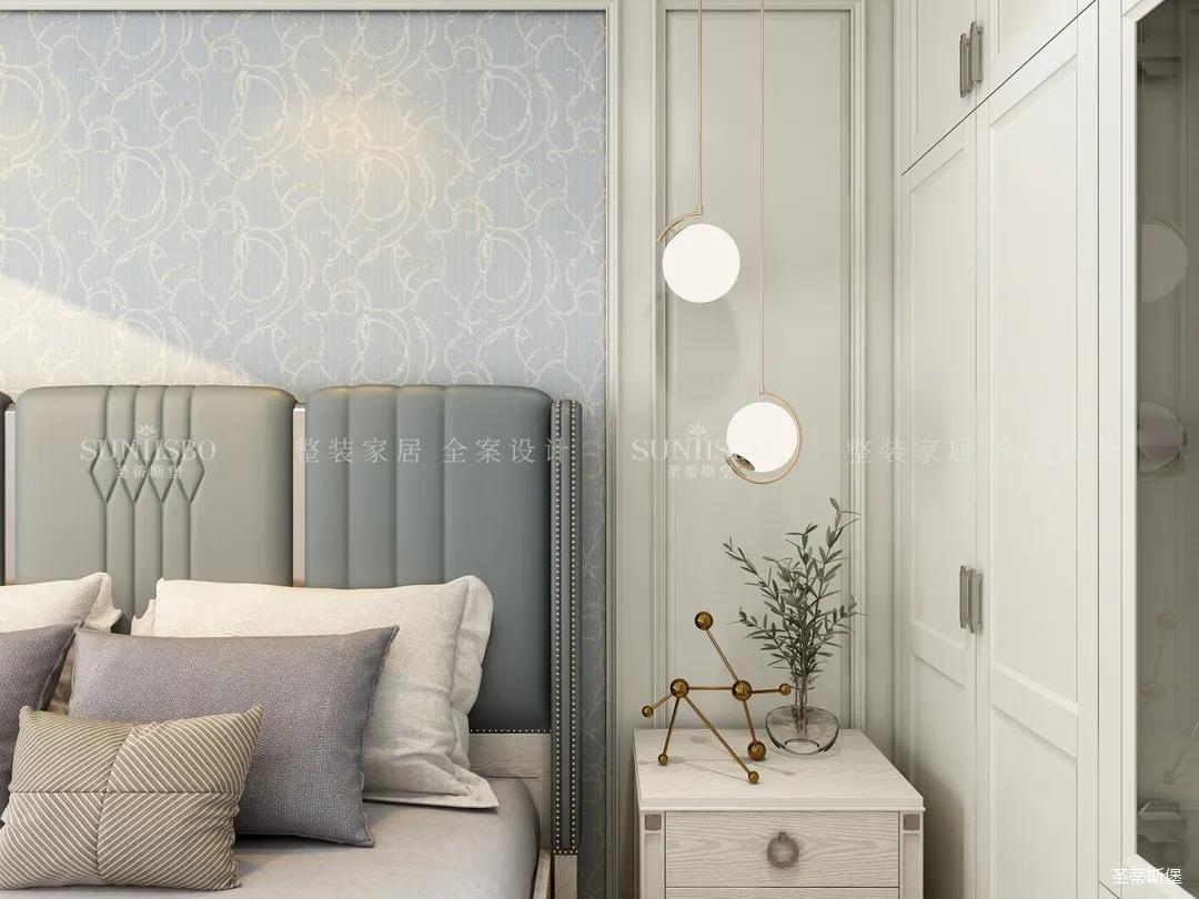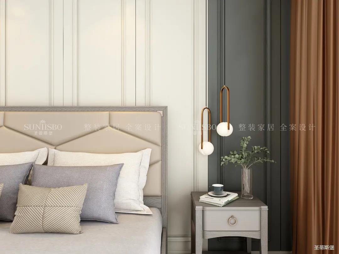 主臥在最大程度上表達了業(yè)主太太最愛的線性美,背景木飾面保留了純粹的視覺體驗,深灰與米白按比例調和搭配,深淺碰撞,在跟隨時尚的同時,也形成了秩序感的層次劃分。