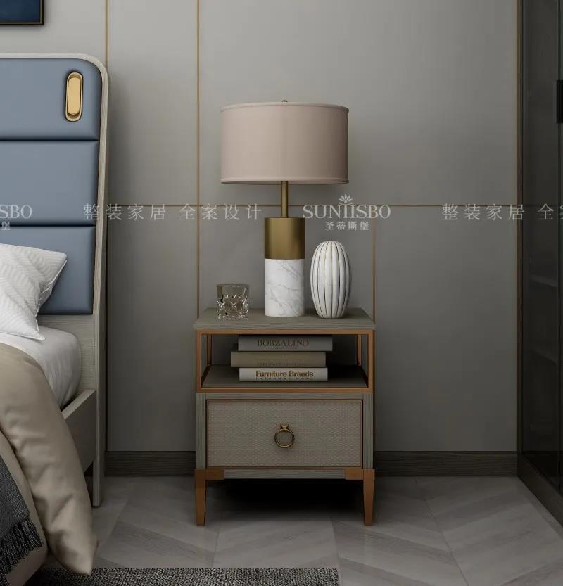 洛斯系列在現代時尚的基礎上還增加了許多輕奢的金屬元素,金屬元素在輕奢風里毋庸置疑的存在。為什么人喜歡戴耳環、戒指、項鏈等首飾?為什么衣服、鞋子、包包上都能看到金屬元素的身影?從時尚圈到家居界,金屬元素憑借其獨特的質感以及由內散發的高級氣質,有著強大的包容性,提升風格格調,增添時尚氣息。運用在家居中可成為整個空間的亮點,成為時下家居裝修的潮流趨勢,深受大家的喜愛。但是目前市面上采用金屬鑲嵌工藝的多數是在板木結合的基礎上,難度相對簡單易操作。在洛斯系列里,是在實木的基礎上進行金屬鑲嵌工藝,要求精準度非常高,誤差不得超過0.5毫米,不然就會對不齊。在洛斯系列中,桌子的四角與腿部、柜類門板,沙發腿部,茶幾支架,餐桌臺面,床品外框等都將金屬恰到好處地融入到空間的每個角落,讓空間擁有輕奢的高級感,提升空間的質感。將優雅謙遜的都市精致感全面呈現,讓裝修冷中帶暖、沉靜精致,也向人們展示了一種精致的生活方式,更為整個家注入靈動氣息。